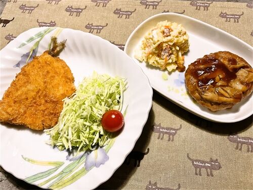 アジフライ (スーパーの惣菜) ハンバーグ (冷凍食品) ポテトサラダ (中国妻料理)